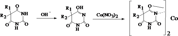 1. С солями кобальта в щелочной среде. В результате реакции образуется комплекс состава Co(NH3)6OHBarb2, окрашенный в красно-фиолетовый цвет. Чувствительность реакции 30 мкг. Реакция неспецифична для барбитуратов. Её могут давать и другие соединения, по химическому строению сходные с барбитуратами (теобромин, теофиллин, биурет, некоторые сульфаниламиды).