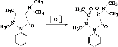 При действии на амидопирин окислителей образуется ряд окрашенных промежуточных продуктов. При дальнейшем окислении этих продуктов образуется диоксиамидопирин (бесцветные кристаллы):