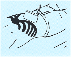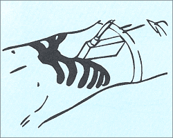 3.Техника получения подреберного среза печени. Помещаем датчик под правый нижний реберный край (рис. 3) и, легко нажимая на кожу, производим веерообразные движения сверху вниз и снаружи кнутри (рис. 4). Когда мы направляем датчик вверх, то видим печеночные вены (рис. 5) и изучаем сегментарное строение печени. Затем, направляя датчик немного вниз, можно увидеть вены воротной системы (рис. 6).