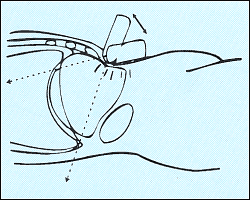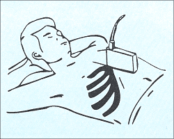 Позиции для сканирования печени. Исследование проводится в положении больного вначале на спине, а затем в положении на левом боку. Последний вариант часто улучшает визуализацию правой доли, выводя ее в брюшную полость из-под ребер. Можно выполнять сканирование в положении больного полусидя, а также со спины (особенно у пациентов с асцитом). Заведение правой руки больного за голову расширяет межреберные промежутки и улучшает контакт передатчика.Такое полипозиционное исследование позволяет лучше изучить внутреннее строение печени.