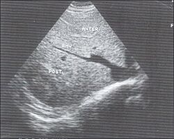 5.Техника получения поперечного среза печени. Поперечный срез печени может быть получен поворотом датчика на 90° от продольного положения и проведением его через печень (рис. 9). Эти срезы значительно помогают при оценке дилатации внутрипеченочных желчных протоков, которая отчетливо видна на поперечных срезах правой доли.