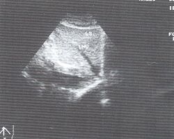 7. Оценка состояния печени в условиях серой шкалы. Оцениваются: передне-задний размер правой и левой долей (норма 12,5 и 7,0 см, соответственно); состояние капсулы и контуров, структура и эхогенность органа; диаметры вен печени; желчные протоки и холедох. Обращается внимание на состояние круглой связки печени (на предмет выявления просвета параумбиликальной вены).