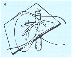 Определение количественных показателей гемодинамики печени. Больной исследуется в положении лежа на левом боку. Сканирование проводится из доступа через межреберные промежутки (интеркостальный доступ) или из правого подреберья (субкостальный доступ) в зависимости от оптимальной видимости исследуемого сосуда и его хода по отношению к углу инсонации. Задержка дыхания производится больным вне фазы глубокого вдоха или выдоха, что снижает влияние фаз дыхания на характер кровотока в исследуемых сосудах. При определении скоростей кровотока сканирование проводится таким образом, чтобы направление распространения ультразвуковых волн максимально совпадало с продольным ходом сосуда и не превышало 60 градусов по отношению к нему. Величина пробного объема, помещаемого в середину просвета сосуда, составляет приблизительно одну его треть. При измерении таких уголнезависимых величин, как индекс резистентности (RI) и пульсационный индекс (PI), коррекция угла инсонации имеет меньшее значение. При исследовании кровотока во внутрипеченочной части основного ствола воротной вены Nishihara (1994) отметил наилучшие результаты при сканировании из межреберного доступа. Он помещал контрольный объем в основной ствол воротной вены за 1-2 см до ее бифуркации на левую и правую долевые ветви. С учетом данных литературы и своего личного опыта мы считаем указанную выше позицию оптимальной для определения скоростных показателей воротного кровотока (см. рис.).