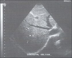 Заканчиваем абдоминальную ультрасонографию печени, устанавливая датчик в 7-10 межреберье для исследования свода правой доли печени, который порой не удается ясно визуализировать, особенно у тучных больных. Кроме того, межреберный доступ может помочь при осмотре сосудов и желчного пузыря.