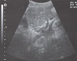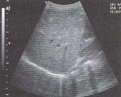 Датчики для визуализации печени. Используются датчики с частотой 3—5 МГц. В зависимости от размеров тела пациента следует использовать датчик максимальной частоты, которая обеспечит проникновение на необходимую глубину. При исследовании левой доли можно использовать более высокие частоты, так как эта доля меньше.Изогнутые линейные матрицы дают хорошее разрешение при исследовании левой доли (ближнее поле), справа следует использовать субкостальный доступ. Для сканирования межреберных промежутков часто необходим секторный датчик.Временное усиление и суммарное усиление следует подстраивать таким образом, чтобы они обеспечивали адекватное проникновение внутрь правой доли печени и гладкую гомогенную картину паренхимы печени, имеющую одинаковую яркость на всех глубинах.