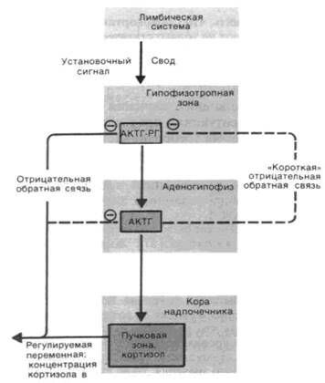 Рис. 2.1.2. Схема регуляции секреции глюкокортикоидов в коре надпочечника посредством КРФ и АКТГ; отрицательная обратная связь тормозит в первую очередь секрецию КРФ (влияя на АКТГ лишь незначительно).