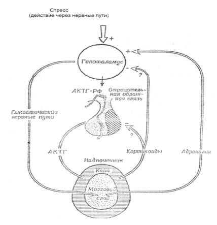 Активность и реактивность стресс-системы регулируются различными механизмами. Важную роль играют процессы саморегуляции (рис.2.4-2.6.). Механизм саморегуляции реализуется за счет влияния друт на друга компонентов самой системы.