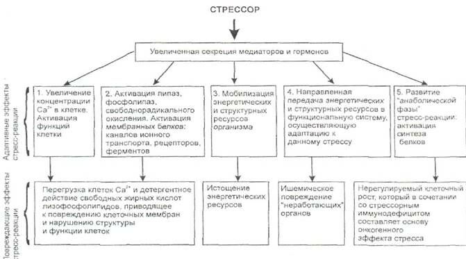 Мобилизация энергетических и структурных ресурсов выражена при стресс-реакции достаточно сильно и обеспечивает "срочную" адаптацию организма к стрессорной ситуации, т. е. является адаптивным фактором. Однако в условиях затянувшейся интенсивной стресс-реакции, когда не происходит формирования "структурных следов адаптации", иными словами, не происходит увеличения мощности системы энергообеспечения, интенсивная мобилизация ресурсов перестает быть адаптивным фактором и приводит к прогрессирующему истощению организма.