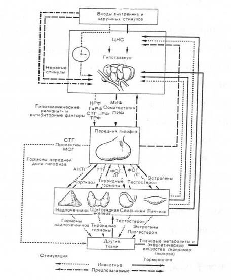 Рис. 2.1.6. Основные петели обратной связи в нейроэндокринной системе, отражающих взаимодействие ее компанентов.