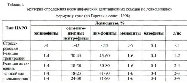 В природе и повседневной жизни встречается громадное количество слабых раздражителей, на которые организм реагирует, хотя они и слабые. Но может ли это быть такая же реакция, как на сильные раздражители? Есть ли смысл, например, в подавлении защитных систем, в защите от слабого раздражителя ценой повреждения? Ответ напрашивается сам собой: ведь слабые раздражения не угрожают жизни, и, может быть, было бы целесообразно не реагировать на них вообще. Но организм должен вначале проанализировать, убедиться, что это раздражитель слабый, т.е. «сориентироваться» и «на всякий случай» привести свои защитные системы в состояние «боевой готовности». Это первая стадия в реакции организма на слабое воздействие, названная стадией «ориентировки». Она формируется через 6 ч и длится 24-48 ч после воздействия. Комплекс изменений, соответствующий паттерну реакции тренировки выглядит следующим образом: в мозгу - преобладание охранительного торможения, в тимико-лимфатической системе - ни признаков угнетения, ни выраженной стимуляции, функциональная активность щитовидной, половых желез и минералокортикоидной функции - в пределах нижней половины зоны нормы, глюкокортикоидов - верхней. Число лимфоцитов в лейкограмме - в пределах нижней половины зоны нормы. Тимус находится в пределах нижней половины зоны нормы. Картина лимфоидных органов при реакции тренировки соответствует классическому описанию «нормы». Стадию характеризуют определенные значения форменных элементов белой крови: у крыс число лимфоцитов находится в пределах нижней половины зоны нормы(51-60%), число сегментоядерных нейтрофилов - в пределах верхней половины зоны нормы, число лейкоцитов, эозинофилов, палочкоядерных нейтрофилов и моноцитов варьировало. У людей число лимфоцитов находится в пределах нижней половины зоны нормы (21-27%), количество лейкоцитов, эозинофилов, палочкоядерных нейтрофилов и моноцитов - могло быть в пределах нормы, но может и отличаться.