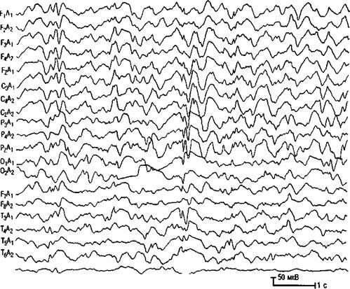 Рис. 3.11. синдром Леннокса—Гасто (СЛГ). Диффузная пик-медленная активность ЭЭГ. Диффузное замедление ритма.