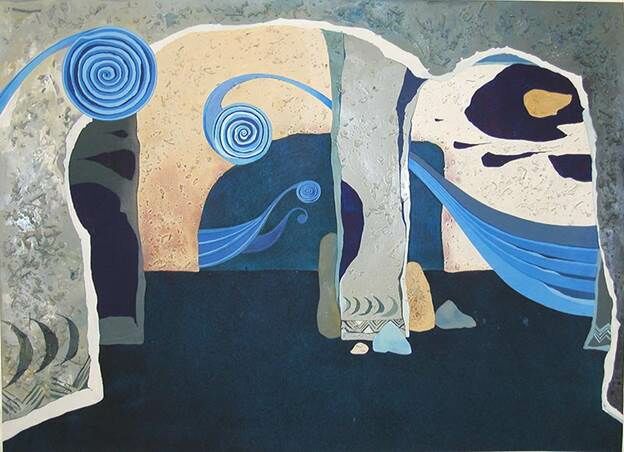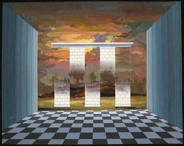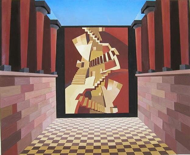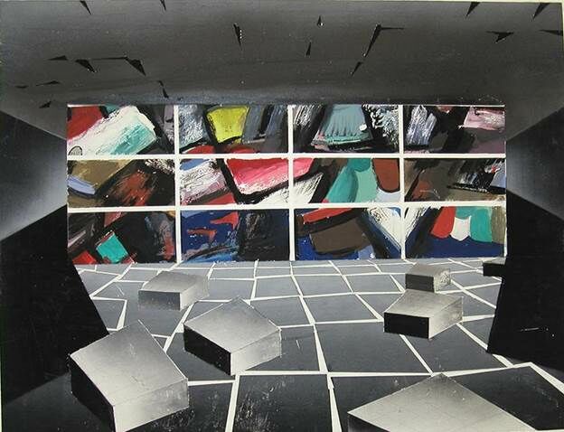 «Крит». Пространство расчленено на резко противостоящие зоны - насыщенную энергией верхнюю и тяжелую косную нижнюю, внушающую мрачные воспоминания о подземном лабиринте, образ которого визуализирован на торцевой стене зала. Автор: Н. Стефанович