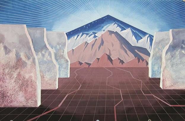 «Интеграл» — кафе для интеллектуалов. Роспись торцевой стены создает ощущение релятивности, призрачности бытия, эфемерности сущего при неустранимом законе ритма и канона в объективной реальности. Автор: О. Данченко