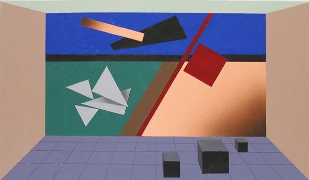 «Квадрат». Здесь концепция пространства иная, чем в предыдущем примере. Свободный полет геометрических «планит» ограничен строгими прямыми линиями и плоскостями, пол и стены производят успокаивающее действие своей окраской. Автор: В. Капралов