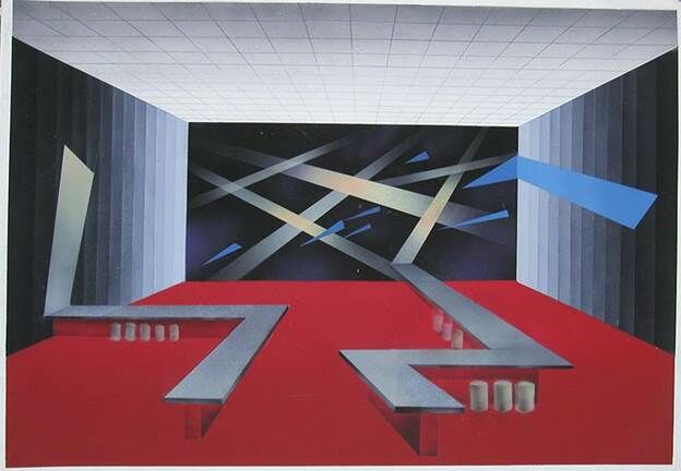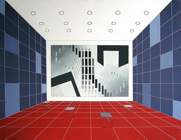 «Футурист». Основной эффект интерьера — переход изображенных плоскостей из двумерного пространства в реальное трехмерное; прием оп-артической растушевки на элементах композиции внушает представление о возможности перехода в n- мерное пространство космоса. Осуществляется мечта художников начала ХХ века о преодолении неподвижности живописи во времени и пространстве. Классическая цветовая система красный–синий–белый вносит сдерживающее начало в несколько возбуждающий динамизм композиции. Автор: Ю. Тореев.