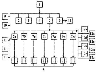 1 – Главный редактор. 2 – Главный бухгалтер. 3 – Заместитель главного редактора. 4 – Редакционная коллегия. 5 – Ответственный секретарь. 6 – Менеджер (коммерческий директор). 7 – Заведующие отделами: а – Собкоровской сети; б – Экономики; в – Политики; г – Социально-бытовых проблем; д – Информации; е – Писем; ж – Иллюстраций. 8 – Корреспонденты отделов. 9 – Обозреватель. 10 – Специальный корреспондент. 11 – Собственные корреспонденты. 12 – Технические службы редакции: а – Машинописное бюро (компьютерный центр); б – Корректорская; в – Библиотека; г – Архив; д – Досье; е – Служба выпуска; ж – Отдел информатики; з – Хозяйственная служба. 13 – Коммерческая часть редакции