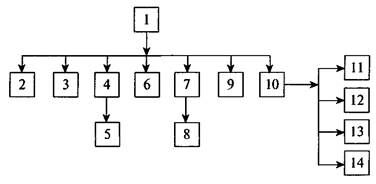 1 – Менеджер (коммерческий директор). 2 – Бухгалтерия. 3 – Отдел маркетинга. 4 – Отдел распространения. 5 – Экспедиция. 6 – Отдел рекламы. 7 – Книжная редакция. 8 – Книжный магазин. 9 – Редакция приложений. 10 – Производственный отдел. 11 – Компьютерный центр. 12 – Печатный центр. 13 – Риэлтерский центр. 14 – Транспортная служба