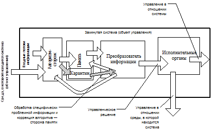 · Прямоугольник с надписью «Замкнутая система (объект управления)» обозначает организм индивида вместе с его психикой как информационно-алгоритмической системой.