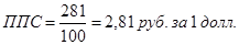 Паритеты покупательной способности валют (ППСВ) представляют собой количество единиц валюты, необходимое для покупки, некоего стандартного набора товаров и услуг, который можно купить за одну денежную единицу базовой страны (одну единицу общей валюты группы стран — долларов США, евро, австрийских шиллингов). Например, для покупки в США условной корзины товаров необходимо иметь 100 долл. США. Для покупки той же корзины товаров в 1998 г. в России необходимо было иметь, с учетом покупательной способности российской валюты, 281 руб. (деноминированных рублей). Это означает, что в 1998 г. паритет покупательной способности рубля по отношению к доллару США составил