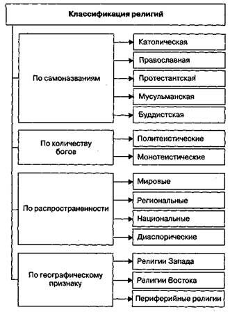 По распространенности религии могут быть подразделены на: всемирные (мировые), региональные и национальные религии (схема 13.5). В настоящее время существуют три мировые религии: христианство, которое имеет в своем составе три основные ветви (католицизм, православие, протестантизм), ислам, состоящий из двух течений (суннизм и шиизм), и буддизм: тантризм (индийский буддизм), ламаизм (тибетский буддизм), чань-буддизм (китайский буддизм), дзен-буддизм (японский). Под региональными понимаются религии, распространенные в нескольких, обычно соседних, странах. Например, индуизм имеет место в Индии и Непале, конфуцианство — в Китае, Корее, Японии, даосизм — в Китае и Японии. Можно выделить еще диаспорические религии, под которыми следует понимать систему верований, свойственную диаспоре, т. е. распыленному по миру этносу, не утерявшему своей идентичности и исторической памяти. К диаспо-рическим религиям можно отнести, например, иудейскую, христианско-григорианскую (армянская церковь) и некоторые другие. К национальным религиям относятся те, которые являются принадлежностью одной нации и, как правило, замыкаются в национальных границах.