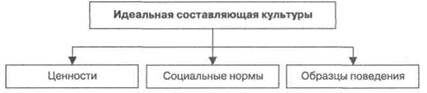 Все структурные компоненты идеальной составляющей культуры состоят из определенных элементов, которые представляют собой, во-первых, ценности, которые могут быть как идеальными представле­ниями людей, социальных групп, общества, так и материальными пред­метами, имеющими функциональное значение в данном обществе. Ценности — идеальные представления и материальные объекты опре­деленных людей и социальных групп, имеющие для них большое зна­чение и определяющие их социальное поведение.