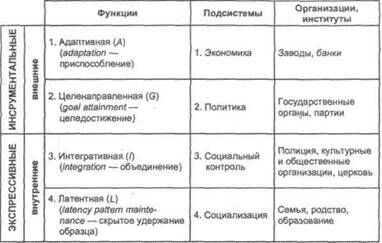 Первые две функции являются внешними (инструментальными) направленными на преобразование природы, третья и четвертая функ­ции направлены внутрь общества. Внутренними (экспрессивными) функциями являются интегративная и латентная. Ей соответствует подсистема контроля, которая поддерживает общую культуру обще­ства (набор ценностей и норм). Латентная, скрытая функция обеспе­чивает сохранение и воспроизводство существующего порядка, под­держание устойчивости путем усвоения новыми поколениями общей культуры общества. Ей соответствует подсистема социализации, кото­рая обеспечивает образование, воспитание, информирование молодо­го поколения. Структура общества имеет сложный характер. Любую подсистему можно представить как систему, состоящую из взаимосвя­занных частей. Например, политическая система может состоять из государственных институтов, политических партий, законов, норм.