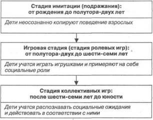 2. Игровая стадия. В этот период у ребенка настолько развились абстрактные представления, что он может подменить реальные предметы игрушками. Дети начинают примерять определенные роли (папы, космонавта, военного). Эту стадию Дж. Мид назвал еще стадией ролевых игр.