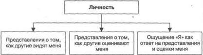 Другой американский социолог, Ч. Кули, считал, что личность есть продукт социальных взаимодействий — интеракций (концепция зеркального «Я»). Представления человека о себе (а это, по понятиям Ч. Кули, и есть структура личности) формируются в процессе взаимодействия с другими людьми. Человек познает себя, представляя, что о нем думают другие, т. е. в интеракциях, как бы отражается в представлениях о нем других людей, как в зеркалах, создает свое зеркальное «Я», которое состоит из трех элементов (схема 4.5):