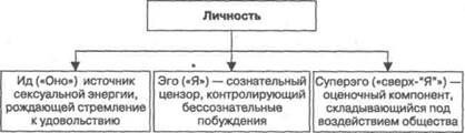 По представлениям 3. Фрейда, человек всегда находится в конфликте с обществом и его биологические побуждения противоречат социальным нормам. Именно в постоянной борьбе с природными инстинктами, с социальным контролем и формируется структура личности, которая состоит из трех составляющих: