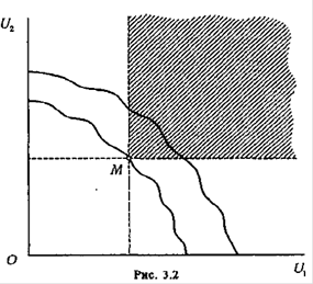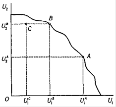 На нем по осям координат откладываются значения функций полезности двух индивидов: U1 и U2 (соизмеримость значений двух функций не предполагается).