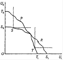 К сожалению, применение критерия компенсации может приводить к противоречивым результатам. Это показано на рис. 3.3. На нем прочерчены две границы достижимых полезностей Т1Т2 и S1S2. Они пересекаются, что, вообще говоря, не исключено.