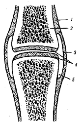 Схема строения сустава. 1 – надкостница, 2 – кость, 3 – суставная капсула,