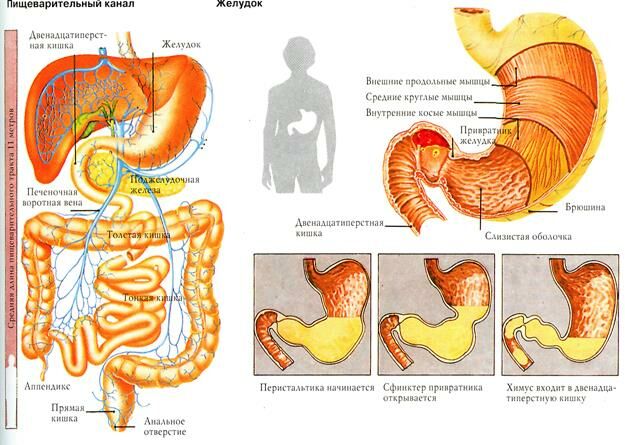 Пищеварение. Процесс пищеварения начинается в ротовой полости, где в течение 15—18 с осуществляется физическая и химическая обработка пищи: перемешивание, измельчение, смачивание слюной, воздействие слюнных ферментов. Затем через пищевод пища поступает в желудок и в течение 6—10 ч подвергается дальнейшей физической и химической обработке. За счет работы гладкой мускулатуры желудка пища перетирается, перемешивается, на нее воздействует желудочный сок. Дальнейшая химическая обработка отдельных порций пищевой массы продолжается в двенадцатиперстной кишке, куда поступает сок поджелудочной железы и желчь, вырабатываемая печенью. Пищеварительные соки двенадцатиперстной кишки продолжают расщеплять питательные вещества в тонком кишечнике, где в основном заканчивается переваривание пищи и всасывание питательных веществ в кровь. Дополнительное частичное расщепление, невсосавшихся продуктов переваривания белка происходит в толстом кишечнике, Эффективность процесса переваривания пищи зависит от того, насколько оптимально количество выделяемых пищеварительных соков и какова активность перистальтических, продвигающих движений мышц желудка и кишечника.