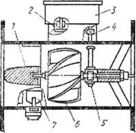 Схема скоростного счетчика с аксиальной турбинкой показана на рис. 8.3. Внутри корпуса размещена горизонтально вдоль направления измеряемого потока жидкости турбинка 6, выполненная в виде многозаходного винта. Перед турбинкой установлен струевыпрямитель 1, предназначенный для сглаживания возмущений потока на входе и исключения завихрения. Вращение турбинки через червячную пару 5 и передаточный механизм 2, расположенный в камере 4, передается через сальник счетному устройству 3.
