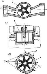 Для измерения количества жидкости при малых расходах используются скоростные счетчики с тангенциальными турбинками. В этих счетчиках турбинка с прямолинейными или криволинейными лопастями установлена на вертикальной оси. Поток жидкости тангенциально подводится к турбинке и приводит ее во вращение. В зависимости от способа подвода жидкости к лопастям турбинки различают однострунные и многоструйные счетчики. Жидкость в одноструйных счетчиках (рис. 8.4, а) подводится к прямому гладкому каналу на лопасти турбинки 1 одной струей через фильтр 2.