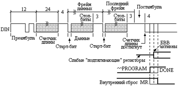 Битовый поток конфигурации, автоматически получаемый с помощью программы Foundation Series 2.1i, представляет соединение битовых потоков всех ПЛИС и имеет один общий заголовок с указателем суммарной длины потока.