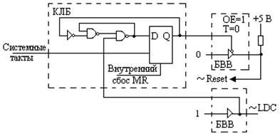 Схема формирования синхронного сигнала ~RESET после окончания процесса конфигурирования ПЛИС. На рисунке 10.2 показана схема, позволяющая устранить эту проблему. Схема использует один КЛБ и два БВВ, один из которых тот, что вырабатывает во время конфигурирования сигнал ~LDC (Low During Configuration – низкий уровень сигнала во время конфигурации). Во время конфигурирования сигнал ~Reset схемы по рисунку 9.2, соединённый с входом RESET ПЛИС, не активен (т.е. равен логической 1), но все триггеры ПЛИС удерживаются в 0 внутренним сигналом сброса MR, действующим только во время конфигурирования. После окончания конфигурирования сигнал ~LDC снимается, на D-вход триггера подаётся сигнал 1, но сигнал ~Reset продолжает удерживаться в логической 1, так как выход Q триг-