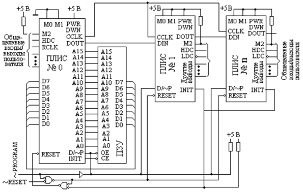 Каскадирование ПЛИС при конфигурировании. Способность ПЛИС вырабатывать 16-разрядный адрес ПЗУ обеспечивает возможность хранения множества программ конфигурации в одиночном ПЗУ, благодаря чему из одного источника могут конфигурироваться несколько ПЛИС, соединённых в гирляндную цепь. Причём первая ПЛИС использует ведущий режим конфигурирования, остальные – подчинённый, управляемый от первой ПЛИС. На рисунке 10.3 приведён пример гирляндной цепи.