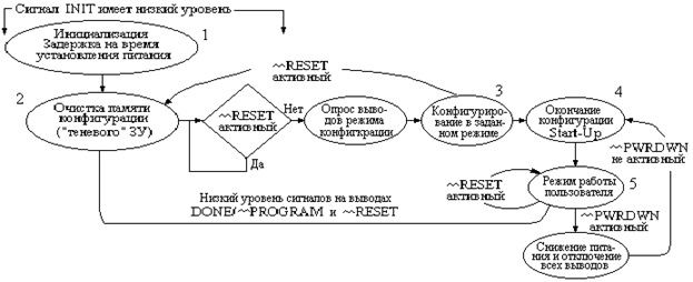 Состояния ПЛИС рассмотрены на примере МС серии ХС3000 фирмы Xilinx. ПЛИС могут находиться в одном из пяти состояний (см. рисунок 9.1):