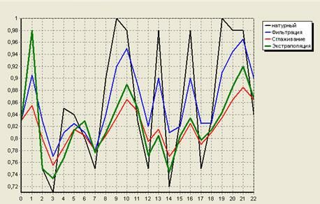 В графическом виде процедуры фильтрации, сглаживания и экстраполяции функции содержания кремния в чугуне представлены на рисунке 4.