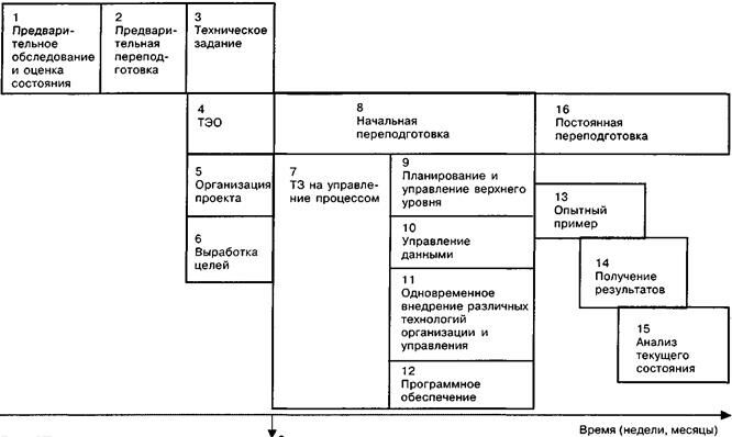 1. Предварительное обследование и оценка состояния Цель этапа — установить, в каком состоянии находится предприятие. Полезно приглашение внешних консультантов. Результаты: краткосрочный план действий, определение возможных направлений работ и рекомендации по стратегии внедрения.