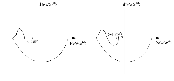 Пусть l=0 и разомкнутая система имеет полюс z=1 второго порядка. Годограф АФЧХ, представленный на рис.27а, соответствует системе, неустойчивой в замкнутом состоянии, на рис.27б - системе, устойчивой в замкнутом виде.