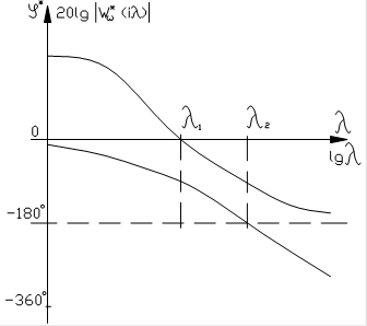 Для выполнения анализа устойчивости импульсной системы с помощью ее логарифмических ПНЧ, обратимся к простейшей структурной схеме замкнутой системы (см. рис.10) и рассмотрим, как должны выглядеть псевдочастотные ЛАФЧХ устойчивых и неустойчивых САУ. С формальной точки зрения критерий Найквиста для дискретных систем аналогичен критерию Найквиста для непрерывных систем [1] . Поэтому все рассуждения, связанные с формулировкой этого критерия в терминах ЛАФЧХ, могут быть перенесены и на дискретные системы. В частности, если разомкнутая импульсная САУ устойчива, то для устойчивости замкнутой системы необходимо и достаточно, чтобы в интервале псевдочастот, где ЛАФЧХ дискретной системы положительна, разность