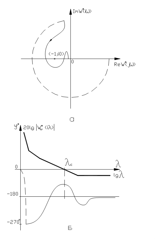 Пусть, например Z -передаточная функция разомкнутой системы имеет полюс z=1 третьего порядка. АФЧХ и псевдочастотные ЛАФЧХ такой системы представлены на рис.29,а,б, где