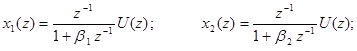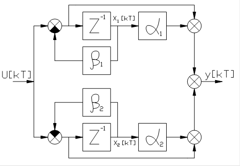 Рассмотрим переход от описания импульсной системы с помощью Z-передаточных функций к описанию с помощью переменных состояния. Как уже отмечалось, выбор переменных состояния не является единственным, и определяется выбором соответствующего базиса. Практически удобным приемом выбора переменных состояния является составление схем моделирования дискретных систем. Схемы включают в себя элементы задержки на такт и сумматоры. Пpи выбope пepeмeнныx cocтoяния импульсных систем за них удобно принимать выходы элементов задержки на такт.