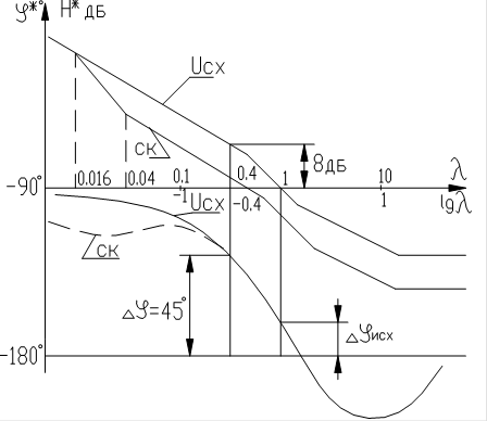 . Для этого АЧХ в окрестности l=0,4 нужно опустить на 8 дб без уменьшения коэффициента передачи системы. Выберем в качестве аналогового регулятора D*(w) модель с передаточной функцией: