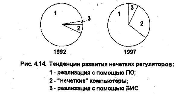 Как видно из этого рис., имеет место тенденция к сокращению удельного веса нечетких регуляторов, реализуемых программными средствами на основе обычных ЭВМ, и, наоборот, возрастает применение специально разработанного для этих целей оборудования, реализуемого на базе последних достижений микроэлектроники и вычислительной техники.