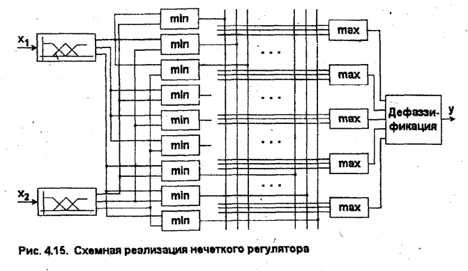 Значительное повышение быстродействия нечетких регуляторов достигается путем аппаратной реализации их алгоритмов. Различают 3 поколения специального аппаратного обеспечения нечеткой логики. Первое поколение "нечетких" БИС (Fuzzy Chips), основанное на аналоговой микроэлектронике, поступило на рынок в 1987 г. На рис. 4.15 приведен пример схемной реализации простого нечеткого регулятора [17].