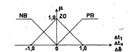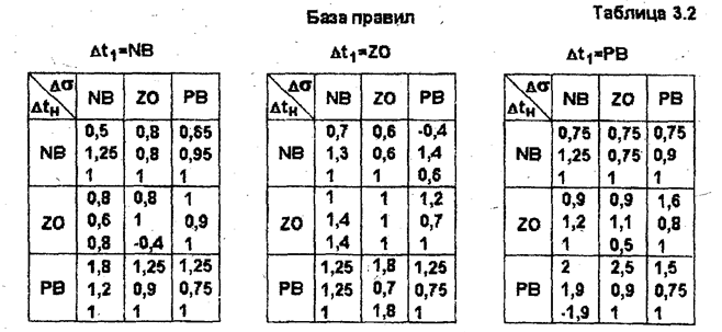 (входы нечеткого регулятора) после их фаззификации с помощью приведенных на рис. 3.11 функций принадлежности подвергаются обработке с использованием записанных в табл. 3.2 правил вывода.