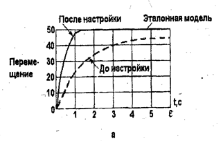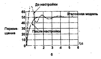 Пунктирными линиями здесь показаны выходы управляемого объекта до выполнения процессов самонастройки указанных выше коэффициентов усиления. Сплошные линии обозначают выходы эталонной модели и совпадающие с ними выходы объекта после выполнения 5 итераций процесса самонастройки. Приведенные на рис. 3.12 результаты моделирования соответствуют случаям самонастройки для предварительно выбранной медленной (а) и быстрой (б) переходной функции САУ.